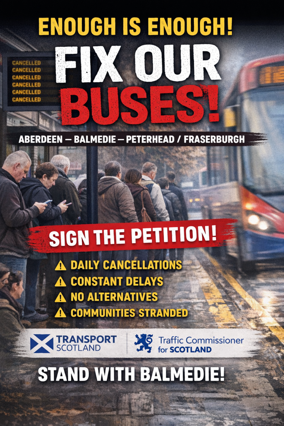 Residents of Balmedie and surrounding Aberdeenshire communities have formally escalated concerns over persistent bus cancellations and delays affecting routes between Aberdeen, Peterhead and Fraserburgh.
